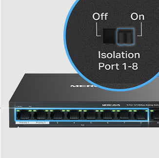 With only one click, isolation mode divides traffic for ports 1-8 to prevent snooping/tampering and isolate broadcast storms for greater protection. MS110P provides 2× uplink ports when turning on the isolation mode.