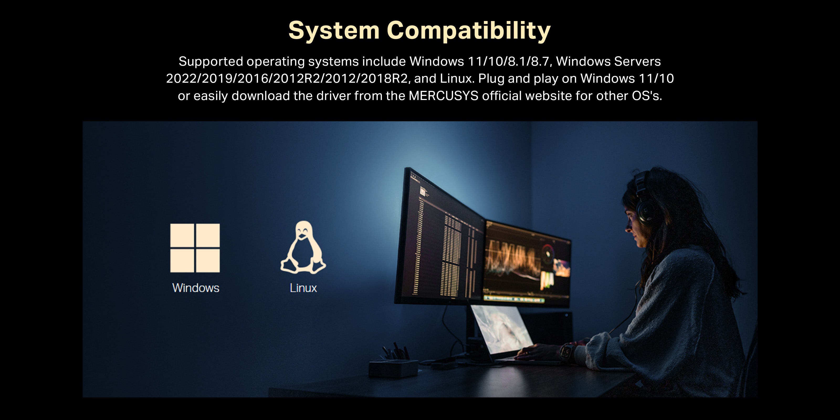 System Compatibility — Supported operating systems include Windows 11/10/8.1/8/7, Windows Servers 2022/2019/2016/2012R2/2012/2018 R2, and Linux. No driver needed on Windows 11/10. Drivers for other systems are available on the official MERCUSYS website.
