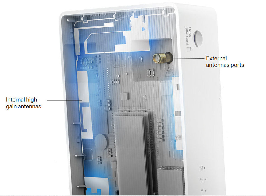 Internal high-gain antennas strengthen the Wi-Fi signal, extend the range of connection establishment, and boost the sensitivity of the router. Additionally, by connecting your extra 4G antennas to the external antenna ports, you may further strengthen the signal.