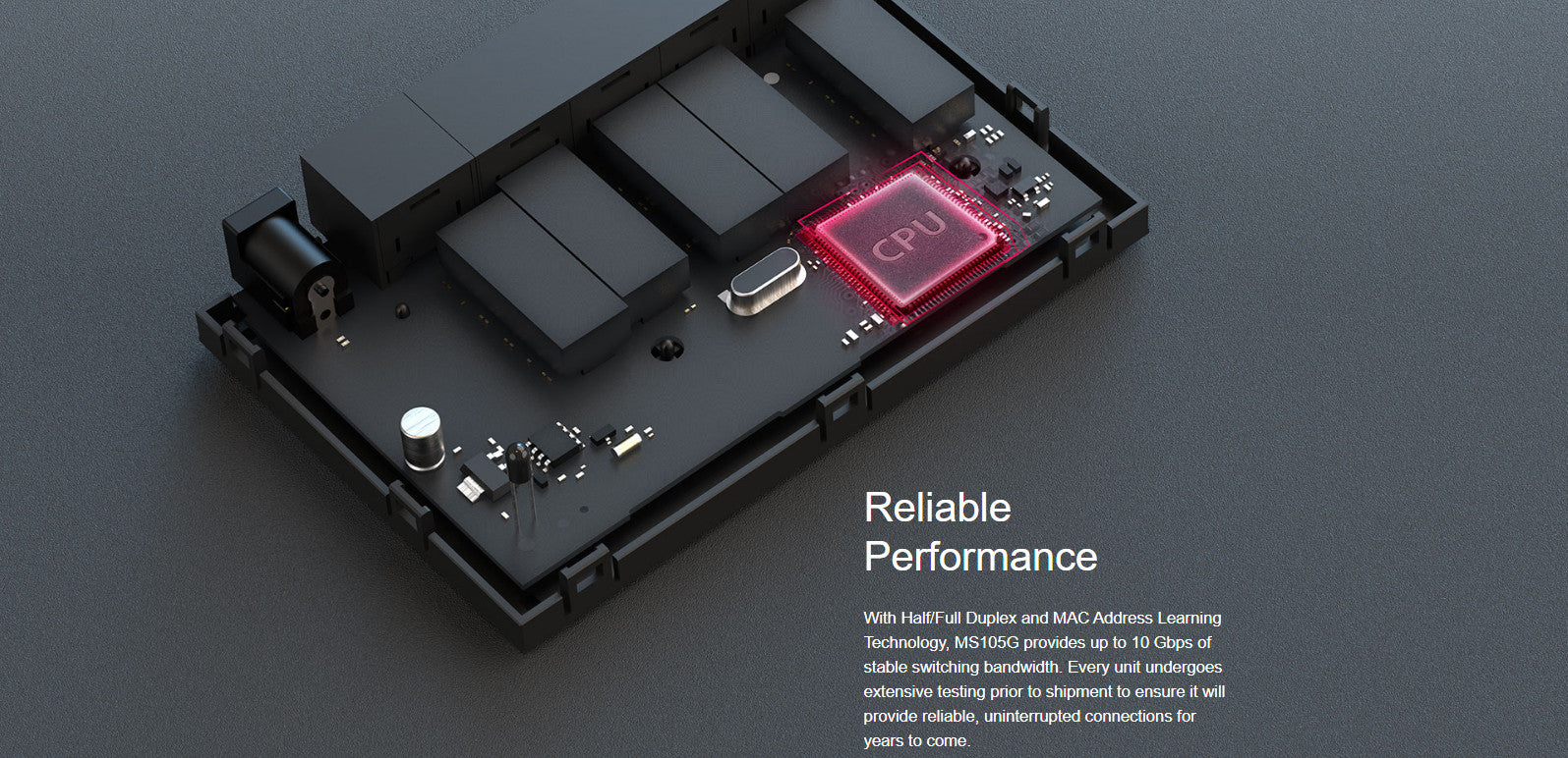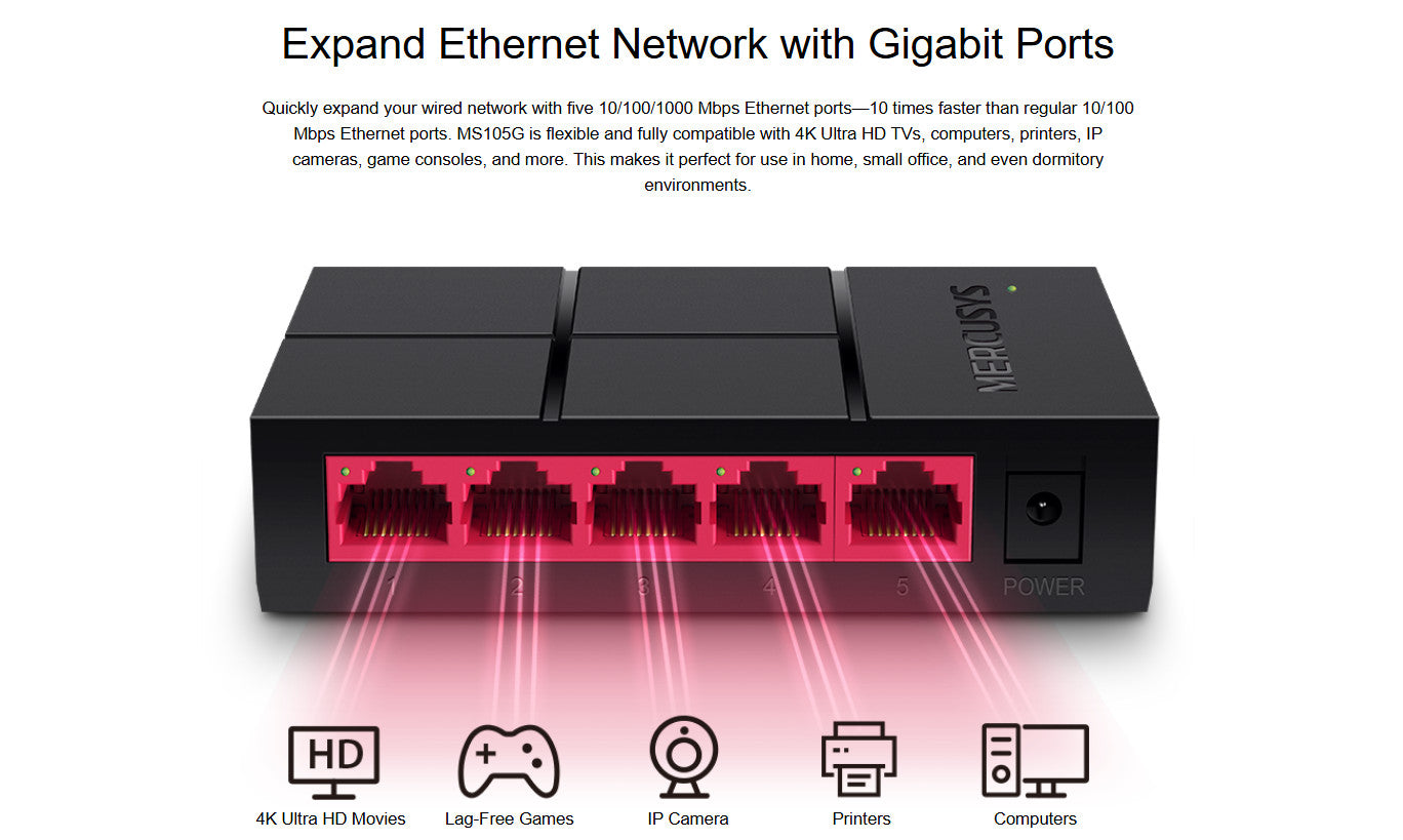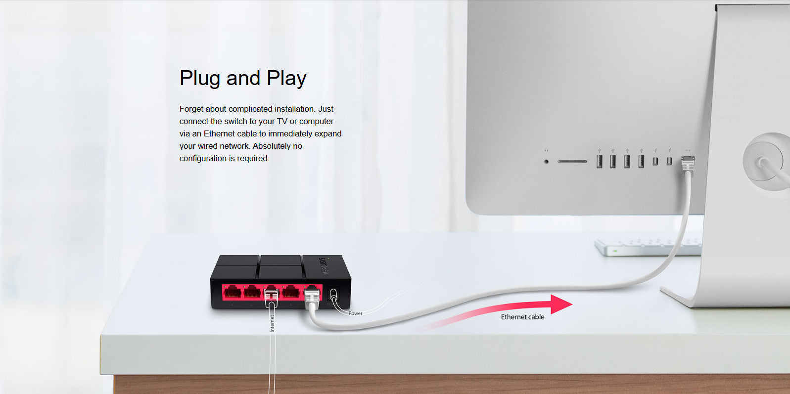 - Five 10/100/1,000 Mbps auto-negotiation RJ45 ports with auto MDI / MDIX supported.