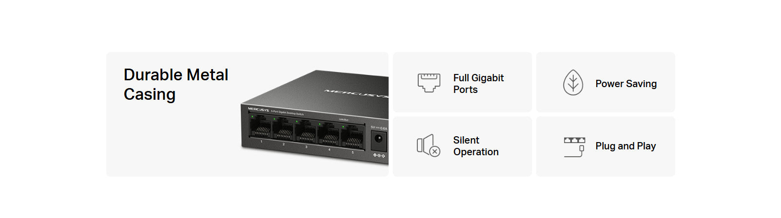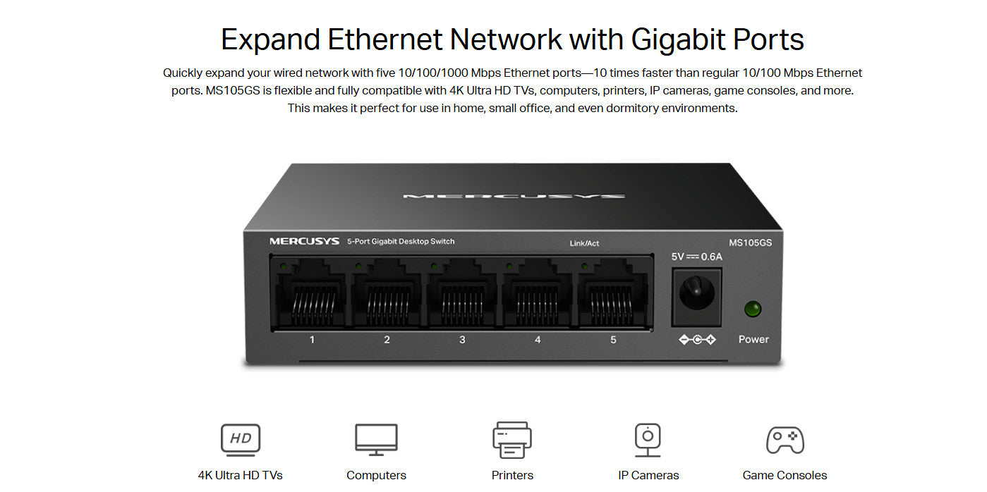 - Full Gigabit Ports: 5× 10/100/1000 Mbps Auto-Negotiation RJ45 port supporting Auto-MDI/MDIX.