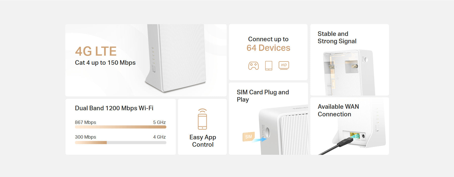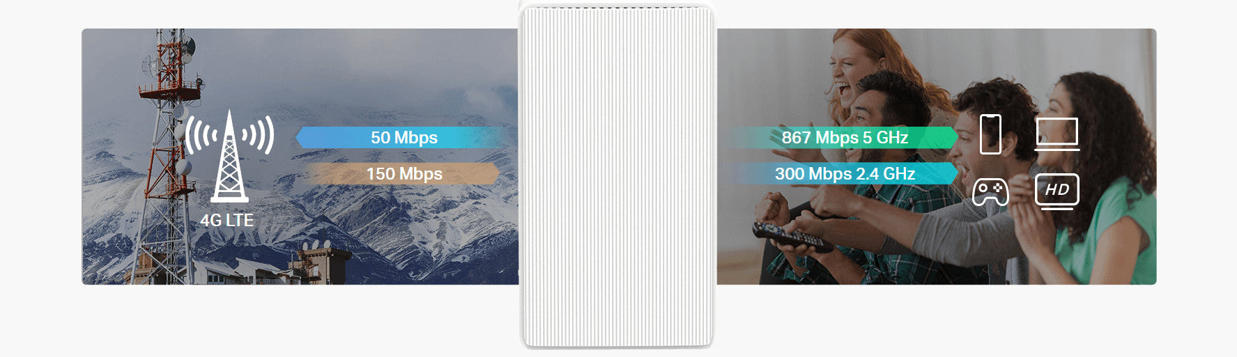 Working as a 4G router, the MB130-4G uses 4G LTE technology to achieve super-fast speeds up to 150 Mbps download and 50Mbps upload. It can also share a dual-band Wi-Fi network with speeds of 867 Mbps on 5 GHz for bandwidth-intensive tasks like HD streaming and gaming and 300 Mbps on 2.4 GHz for internet surfing, email, and social media.