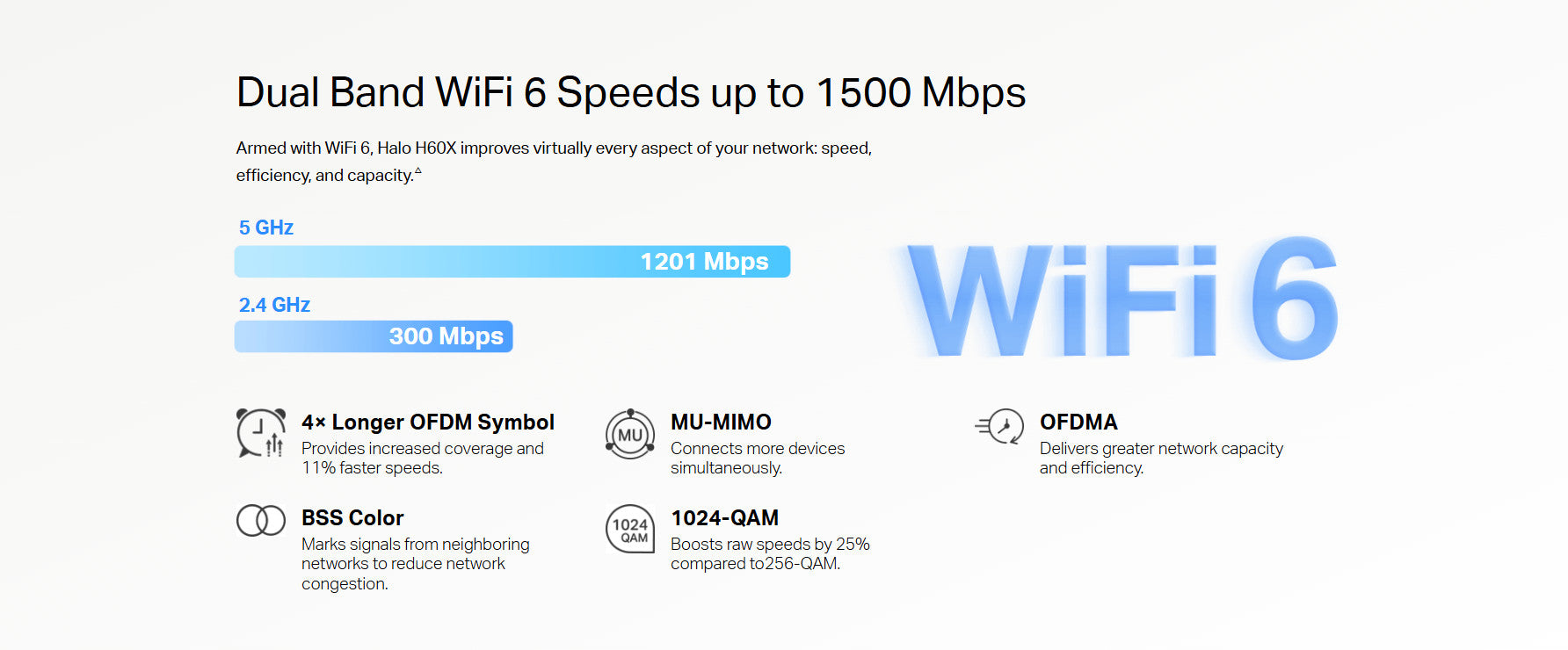- Dual Band Wi-Fi 6 Speeds up to 1500 Mbps: 1201 Mbps on 5 GHz and 300 Mbps on 2.4 GHz. †