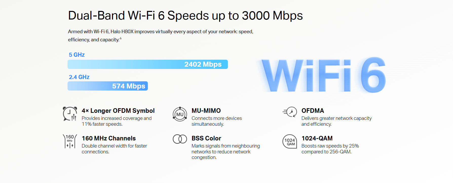 - Dual Band Wi-Fi 6 Speeds up to 3000 Mbps: 2402 Mbps on 5 GHz and 574 Mbps on 2.4 GHz. †