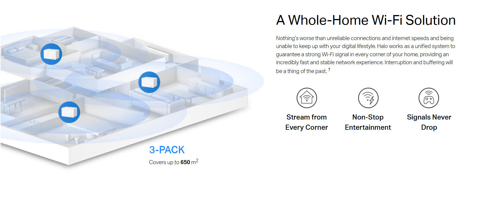 - Whole-Home Coverage: Blanket up to 650 m² with high-speed Wi-Fi, eliminating Wi-Fi dead zones at your home. †