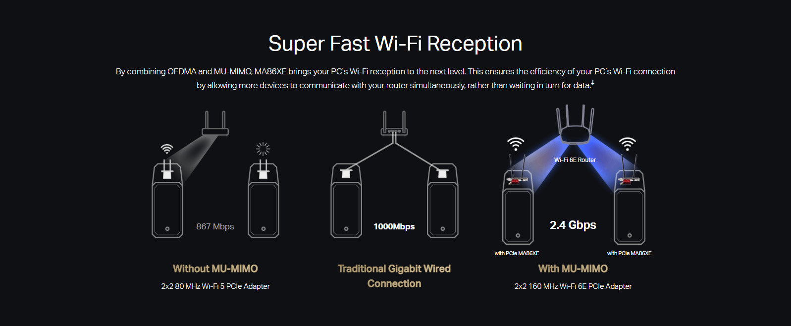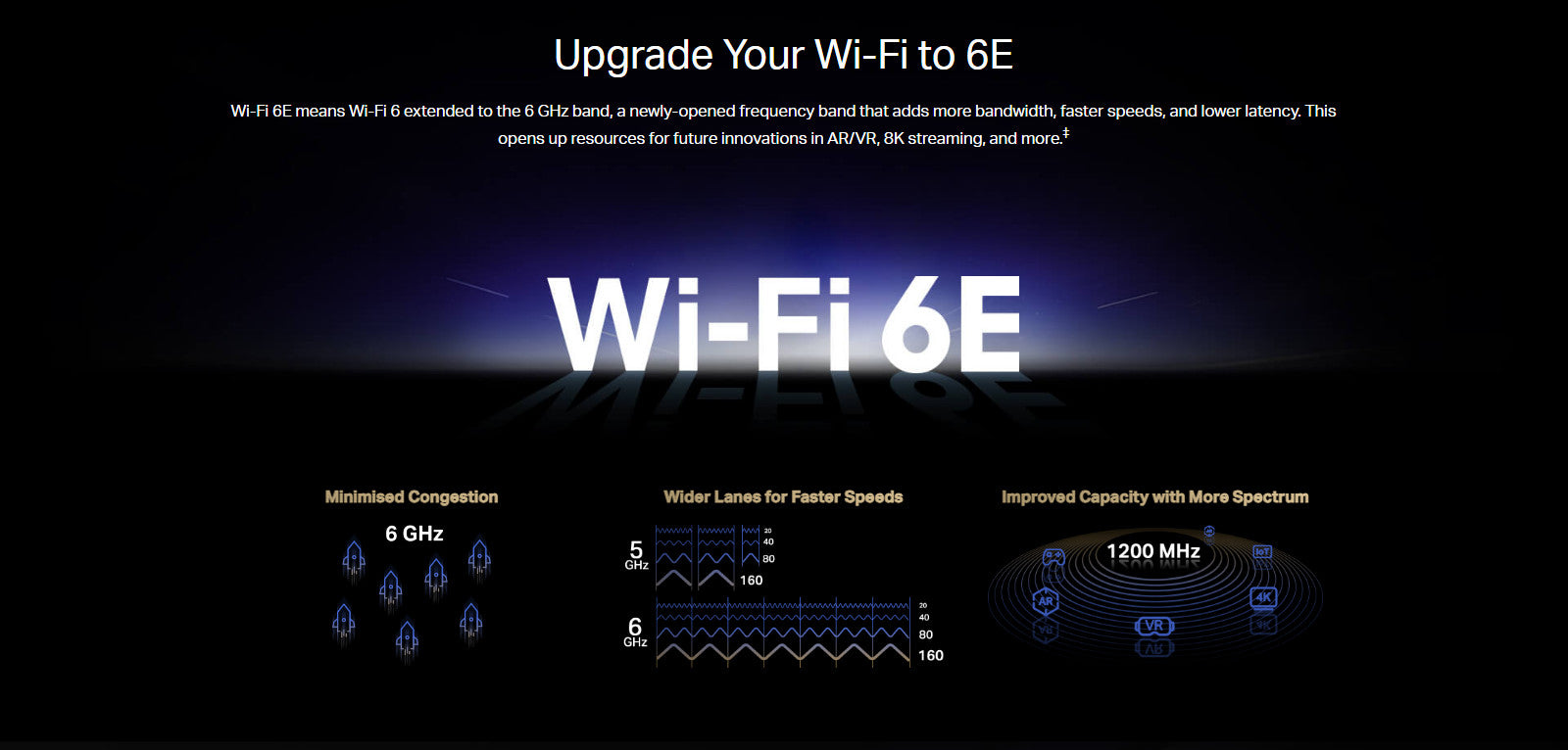 - Wi-Fi 6E Standard: Expand to the clearer, broader 6 GHz band.