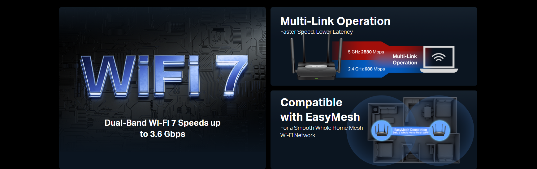 - Newest Wi-Fi 7: Armed with the 160 MHz channels, 4K-QAM, MLO, and other features that Wi-Fi 7 offers, your network will arrive with a jaw-dropping performance. ‡