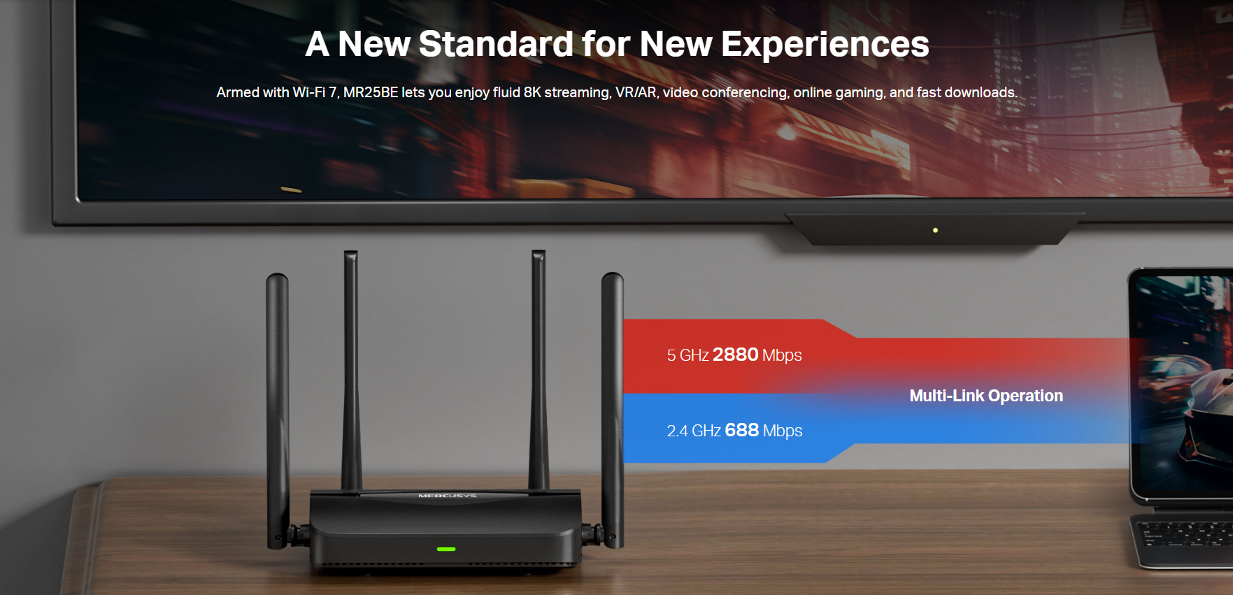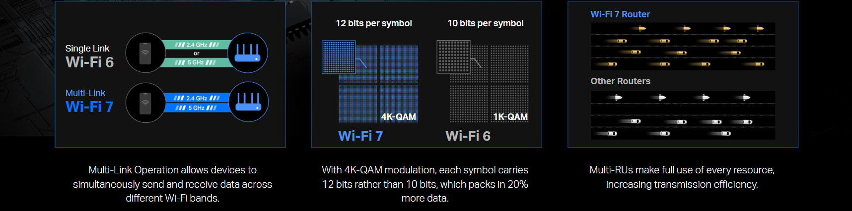 ‡Use of Wi-Fi 7 (802.11be), Wi-Fi 6 (802.11ax), and features including Multi-Link Operation (MLO), 160 MHz Bandwidth, 4K-QAM, Multi-RUs, OFDMA, and MU-MIMO requires clients to also support the corresponding features. The 160 MHz bandwidth on the 5 GHz band may be unavailable in some regions/countries due to regulatory restrictions. This router may not support all the mandatory features as ratified in the IEEE 802.11be specification. Further software upgrades for feature availability may be required. .
