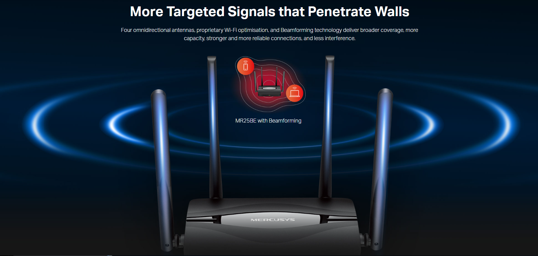 - Maximised Coverage: 4× Omnidirectional antennas, proprietary Wi-Fi optimisation, and Beamforming technology deliver broader coverage, more capacity, stronger and more reliable connections, and less interference.