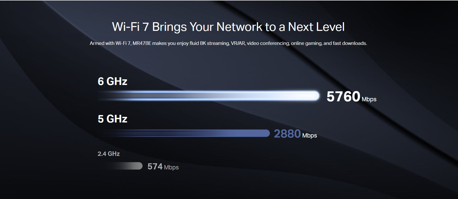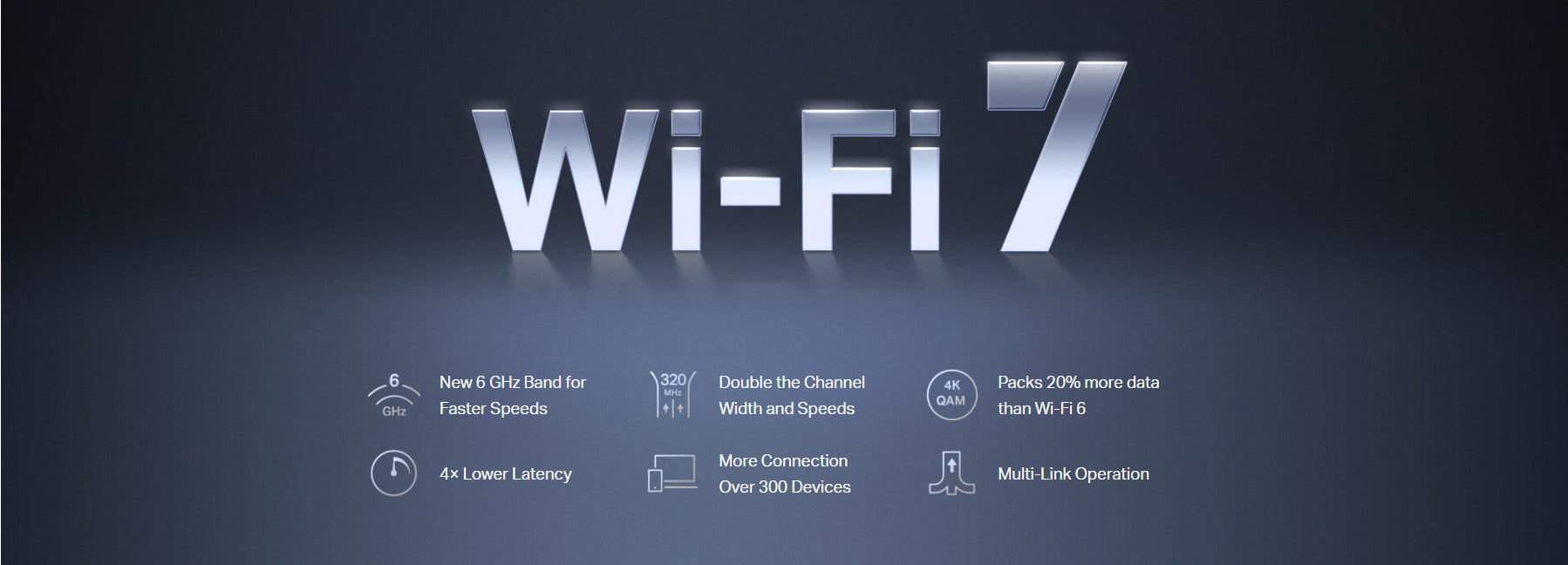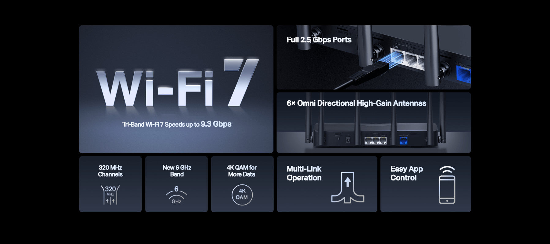 - Newest Wi-Fi 7: Armed with the 320 MHz channels, 4K-QAM, MLO, the 6 GHz band, and other features that Wi-Fi 7offers, you network will arrive with jaw-dropping performance. ‡