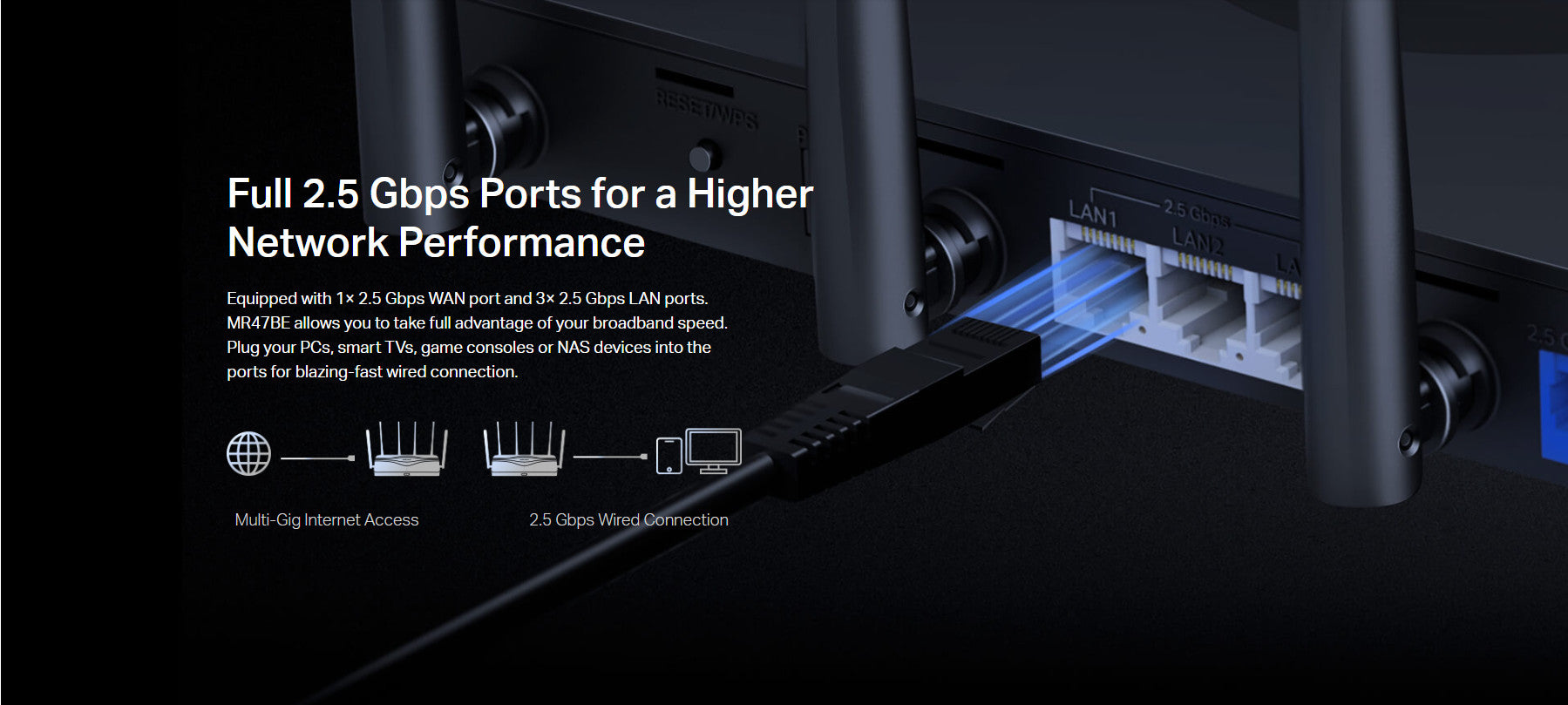 - 4× 2.5G Ports: 1× 2.5 Gbps WAN port and 3× 2.5 Gbps LAN ports break through the 1G bottleneck, driving your devices to peak performance.