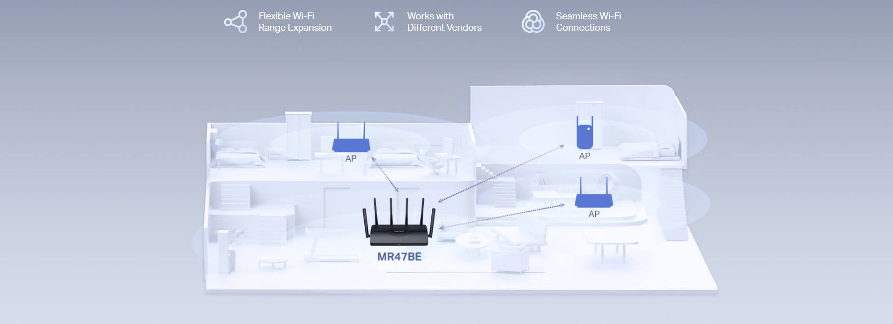 MR47BE is compatible with EasyMesh, enabling you to set up a whole home mesh network with one Wi-Fi name and password with any other APs that support EasyMesh from multiple vendors. Enjoy flexible, scalable, and seamless mesh Wi-Fi throughout your home!