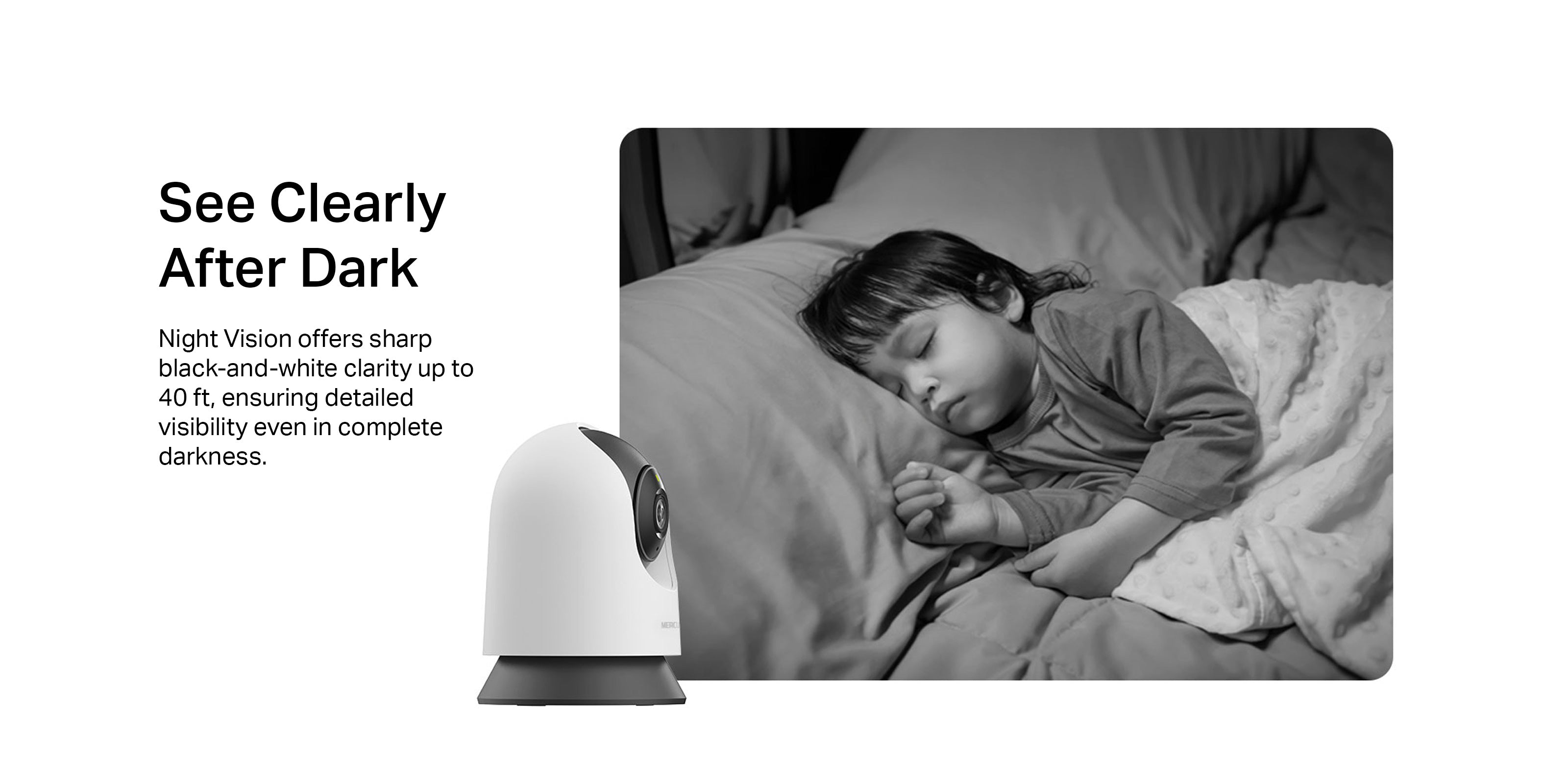 - Night Vision: With advanced night vision up to 40 ft, MC210 allows users to monitor their homes around the clock.