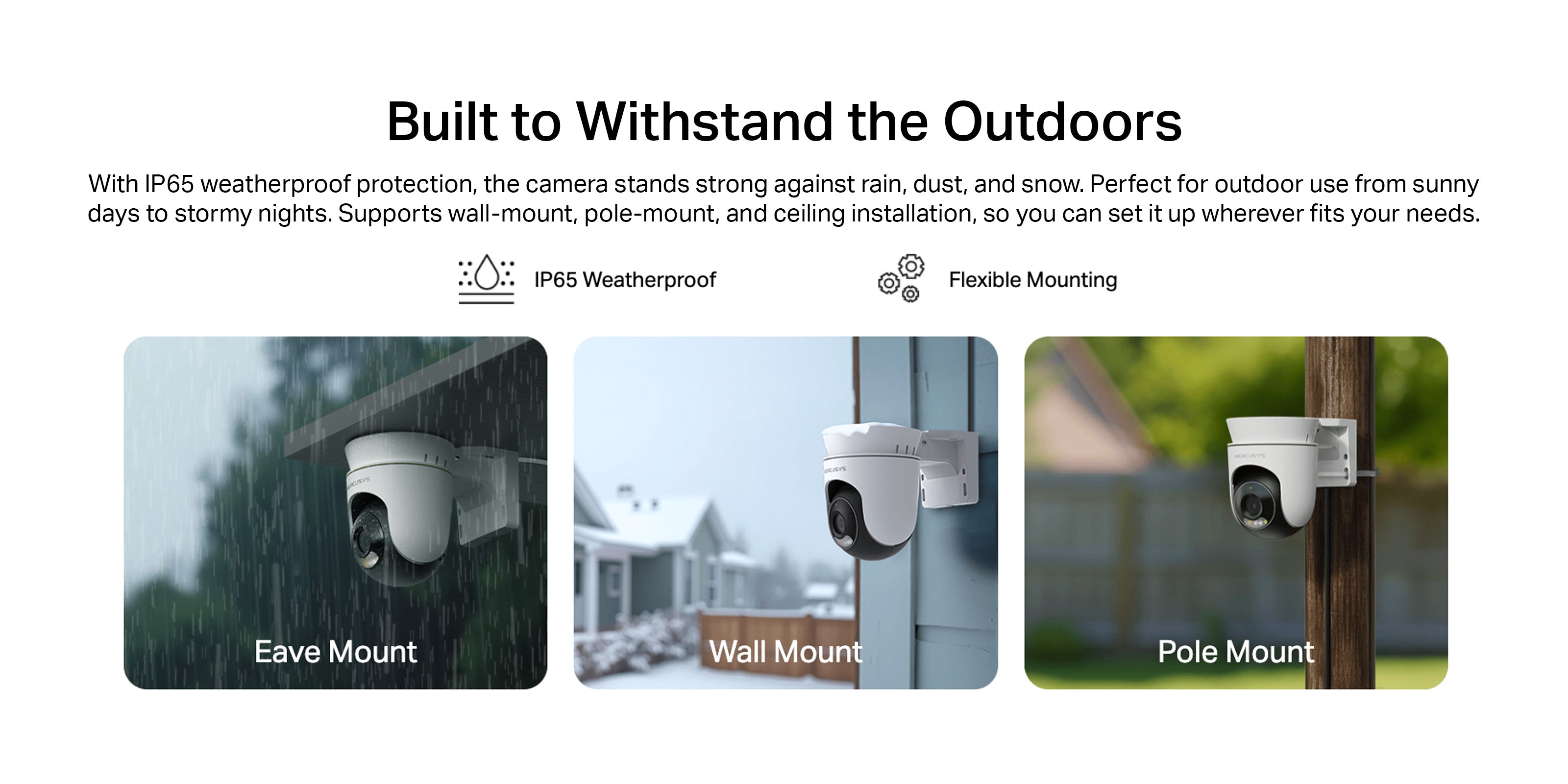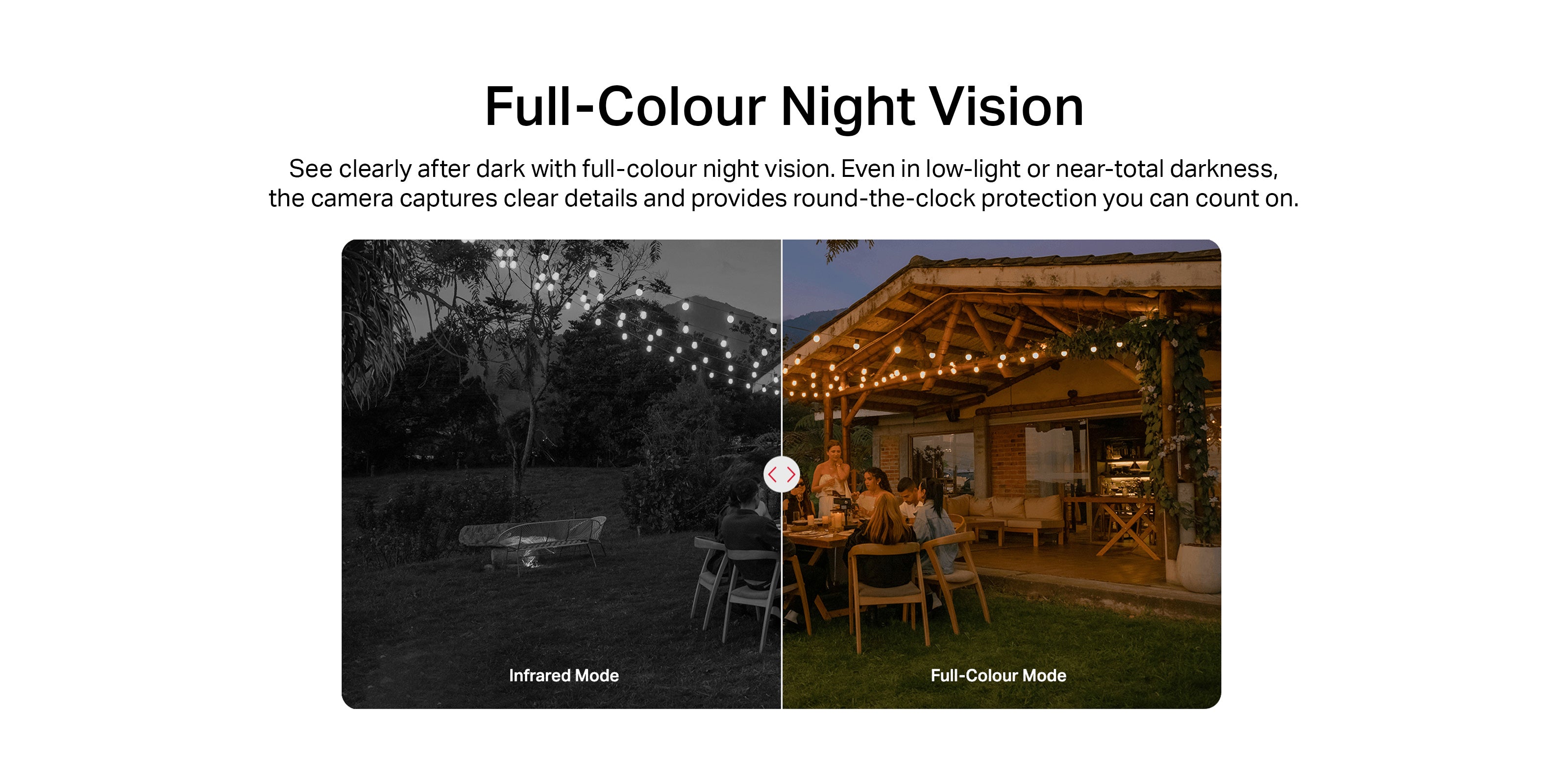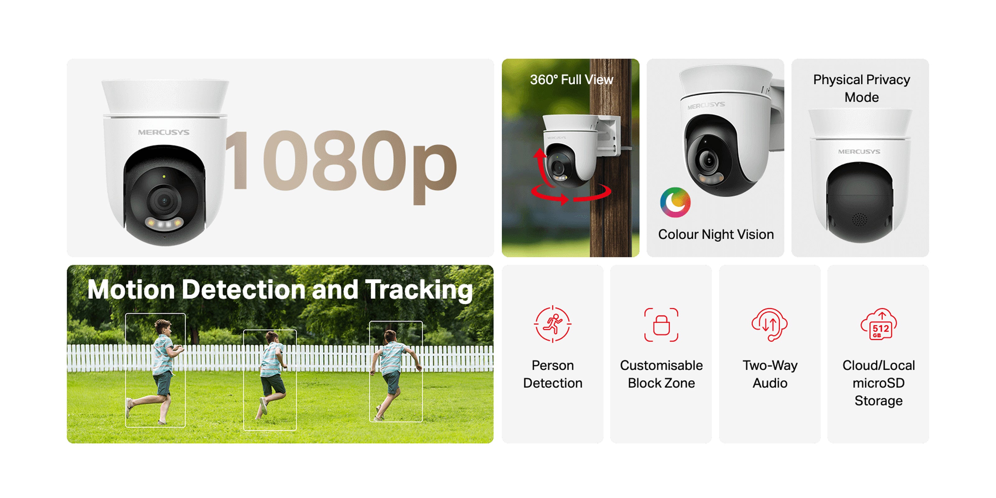 Delivers 1080p Full HD clarity with a 360° view for complete coverage. Features smart motion and person tracking, colour night vision, and customisable alerts. Supports local or cloud storage, is IP65 weatherproof, and includes a privacy lens shield for added peace of mind.